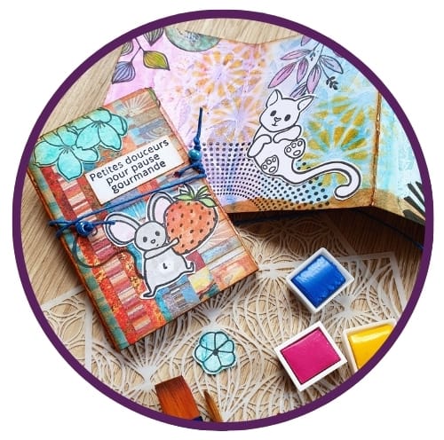 Avec toi et ce que tu nous proposes, on y arrive, c'est très accessible et en plus, petit à petit, on abandonne l'idée de la perfection pour apprendre tout doucement à rebondir sur ce qui sort sur la page, bon ou moins bon . On lâche prise sur le résultat attendu pour jouer avec tes techniques , les couleurs, les couches et même les collages et l'écriture…